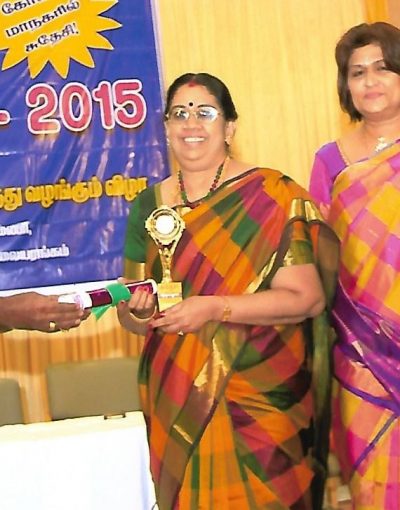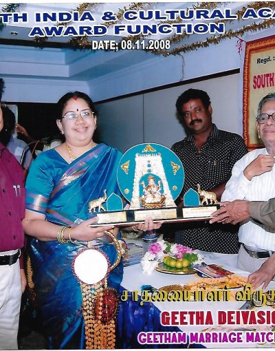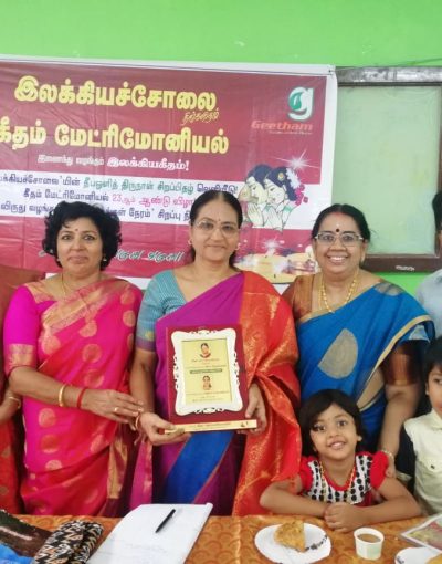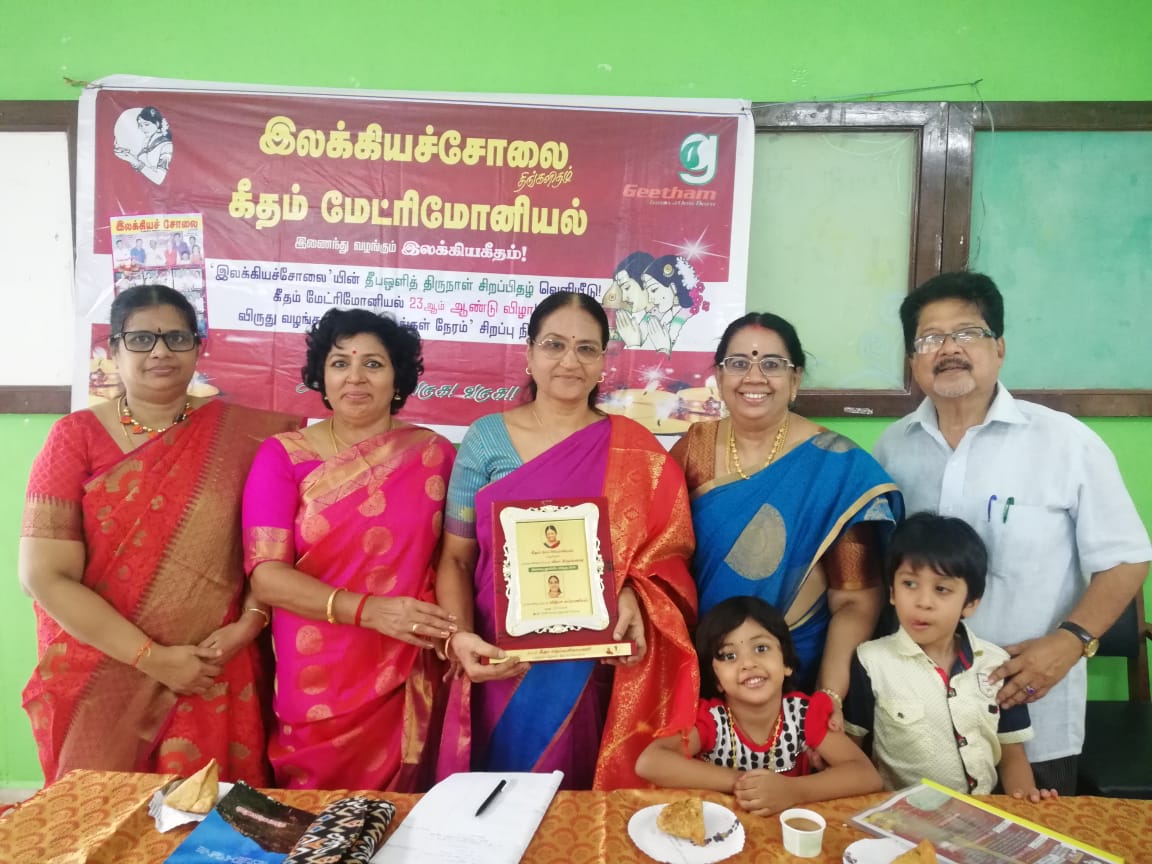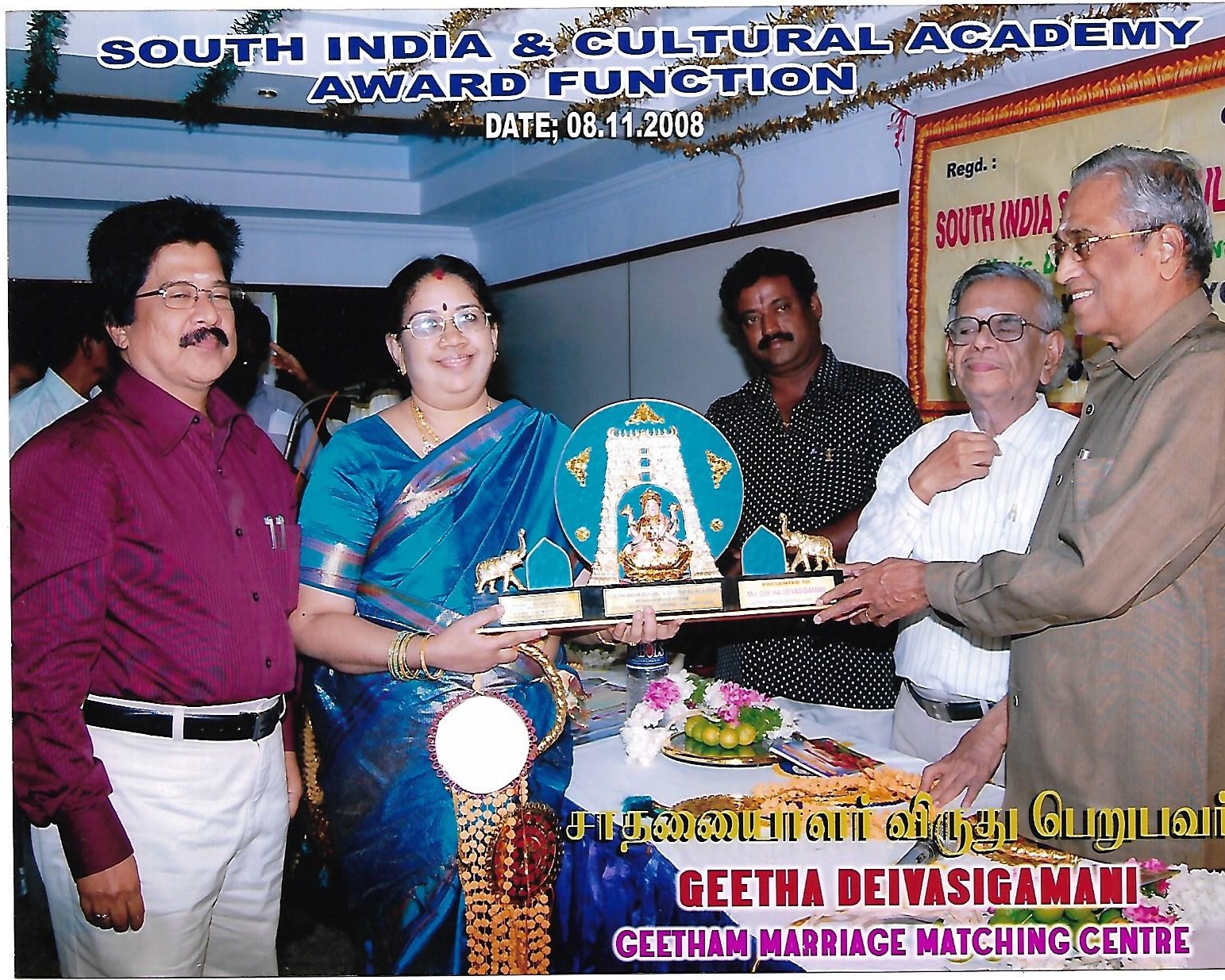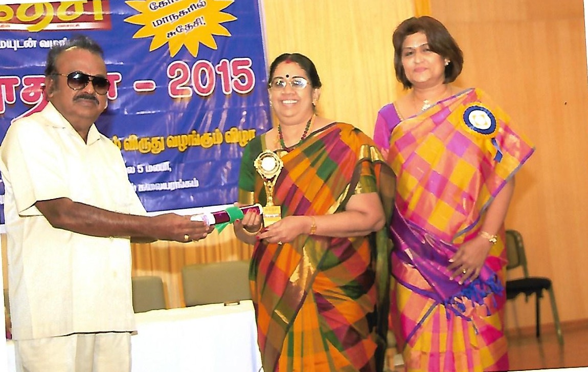 குமுதம் ஆசிரியை திருமதி. லோகநாயகி அவர்கள் கையால் “திருமண திலகம் ” விருது. வழங்கியவர் :இலக்கிய சோலை திரு. சோலை தமிழினியன்.